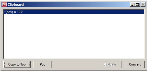 Evaluates the top item on the clipboard. The shortcut for this command is control-shift-Q.