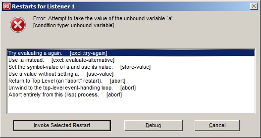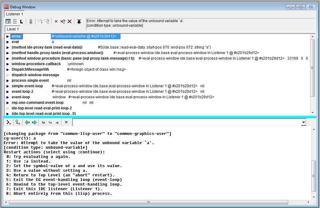 We recommend leaving this option checked for debugging purposes until shortly before delivering an application, and then turning the option off for delivery, to shield the end user from the debugging console and tray icon as well as from the possibility of continuing to use the application after an unhandled error. When this option is turned off and an unhandled error is signaled in the delivered application, the project's default-error-handler-for-delivery function (see the Advanced tab) will be called, where the default function will show a simple dialog informing the user that an unhandled error has occurred and that the application will now exit. The Lisp error string is included in the dialog, but the end user is not allowed to continue running the application in its broken state. To make a Common Graphics application handle errors more cleanly, an application should add its own signal handlers (such as calls to handler-bind) around code that could possibly signal an error.