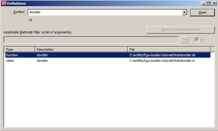 The file selection dialog is then shown, initially displaying only those files whose pathname-types match the requested module type. Specifically, .cl, .lsp, and .lisp files are shown for a source code module, .bil files are shown for a form module, .dll, .so, or .dylib files (depending on the platform) are shown for a shared library module, .lpr files are shown for a sub-project module, all files are shown for a distributed file module or editable file module, and directories are shown (in a different dialog) for a distributed directory module. Selecting a file of the appropriate type will add it to the current project and list it in the Project Manager. The next File | Save All that is done will then save the .lpr project definition file to include a reference to the new module.