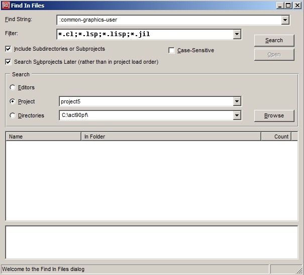 Name: A name for the entire project. This should be a symbol not naming any other project. This symbol is used to name the .exe, .dxl, and certain other files that are created by the File | Build Project Distribution and File | Build Project Executable commands. The name also appears in the title-bar of the IDE, and may be passed to find-project to find the project if it has been loaded with load-project or open-project. Using a keyword for the name is recommended. The project name could be retrieved or set programmatically by calling name or (setf name).