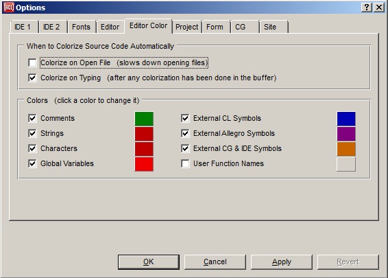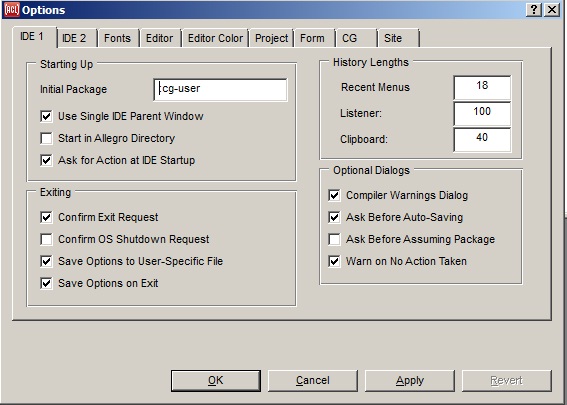 This command, if chosen, saves the current options (the current values on the Options dialog and the current window positions and sizes and which windows are visible) to the file allegro-ide-options.cl. This command is useful if you wish to arrange things as you want them to come up, and then want to be free to make changes for the current session only (such as moving, resizing, or hiding windows). If you use this command, you may want to toggle the Save Options on Exit switch on the Tools menu to off (unchecked) so options are not again saved on exit, perhaps overwriting what you saved now. See The user options file allegro-ide-options.cl in cgide.html for more information on the options file.