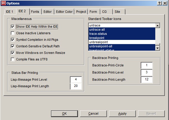 Enable Debugging of Build Errors (console will not exit): if checked, the debugger will appear if an error occurs while generating the standalone application. This is implemented by passing the symbol :interactive as the build-debug keyword argument to generate-application. This allows debugging in the Lisp that was generating the app, but also means that the console for that Lisp will never exit, even when no build error occurs. Therefore, this option is not selected by default, and you would typically select it only if a build error has occurred, and then try again. When this option is selected, the symbol :allow-build-debug will be included in the build-flags of the project.