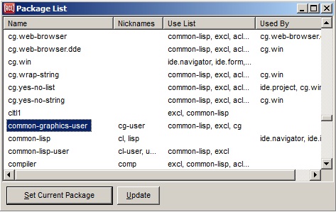 In any case, a basic defpackage form will be written into the generated .lpr project definition file for this project, to ensure that the package will always exist before it is needed. This defpackage form will use the cl, excl, and cg packages, and will export any symbols that are known to be exported from the package. You may add a more complete defpackage form elsewhere in the project code if needed; the package will then be augmented rather than replaced, as usual when there are multiple defpackage forms for a package. See project-package-name and form-package-name for more information.