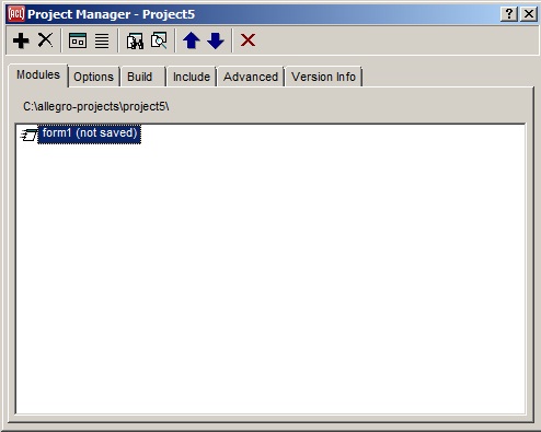 To add a module to the current project, press the Project Manager Dialog's Add File button (identified by a + sign) on the left end of the Project Manager's toolbar. A dialog appears asking which type of module you would like to add.