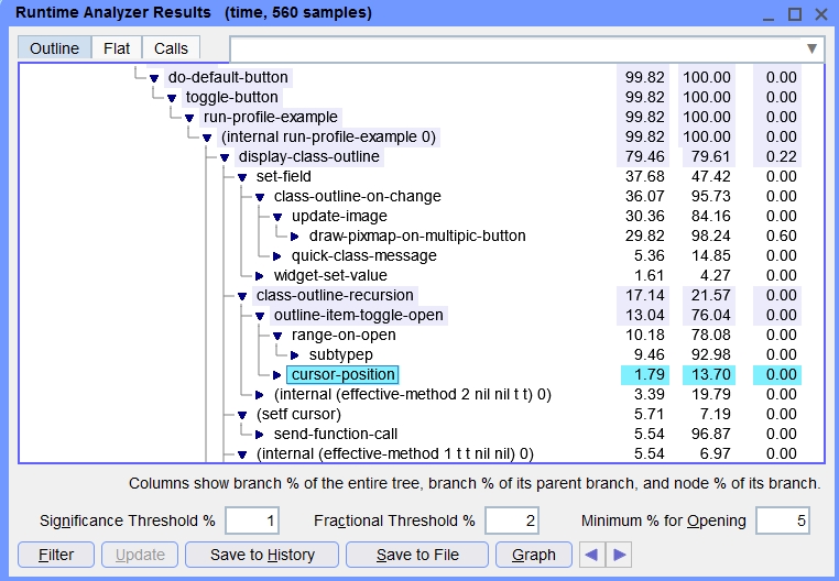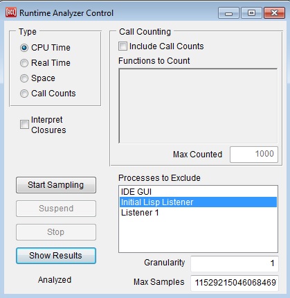 Like Run | Run Project, with additional behavior to perform a runtime analysis of the run. This command wraps a call to with-profiling around the running of the project, and will analyze only the process of the running project. When the project run exits (typically by closing the project's main window), it will also automatically display the new analysis in the Runtime Analyzer Results dialog. The Runtime Analyzer is described in runtime-analyzer.html.