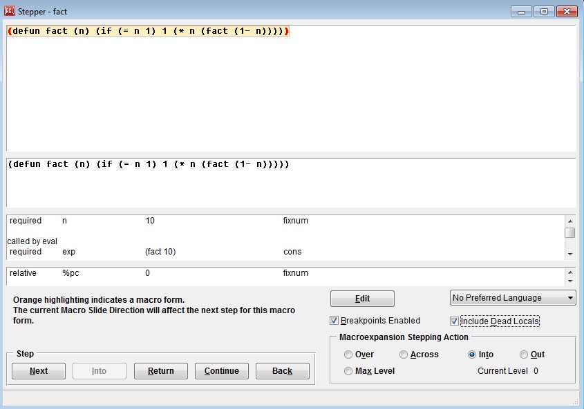If the Stepper Dialog is currently selected, and the Definition Pane has the keyboard focus and is highlighting a selected form, then the breakpoint will be set on the selected form inside the function being stepped through. The selected form is the one under the mouse if any, and otherwise the form at which the stepper is stopped.