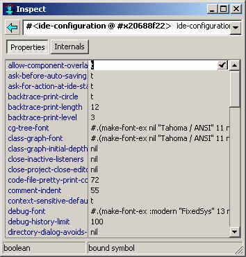 You can examine the configuration by clicking Tools | Inspect System Data | [CG or IDE] Configuration Options (there are two menu items, one for CG options and one for IDE options). The Inspector shows all configuration properties and their values. Values can be changed directly in the Inspector, by clicking on the value and typing or clicking on the extended editor button to the right of the value and entering the new value in the dialog that appears (different dialogs appear for different types of values). Here is the Inspector showing some configuration options: