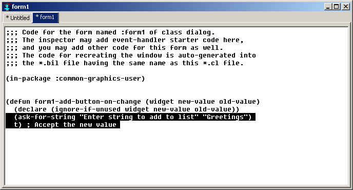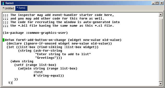 Note that list-box was found using the function find-sibling and the name, :list-box. There are a number of find- functions. find-sibling is best in this case because only the other controls on the form have to be examined. This function now changes the range of list-box to include the entered string (adjoin adds an item to a list if it is not already there – if the new string is equal to a string already in the range, it is not added).