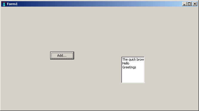 After you have saved the files or not, an active dialog appears. When you click on the Add button, a dialog asking for a string, with default Greetings, should appear. We show part of the form and the two dialogs.