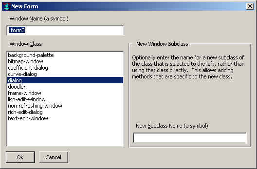 There are more choices shown in the illustration then will be present in a fresh Allegro CL. The additional choices, doodler, curve-dialog, coefficient-dialog and background-palette, were all added as the project was worked on. You are choosing the type of window corresponding to the form. The default choices (everything but the four listed as new) provide many capabilities, but creating new classes of devices is common because you get to add features to the new device class without affecting any existing example of that class. Consider the doodler choice (the device of the doodler window). The doodler class is defined as follows (in final\doodler.cl):