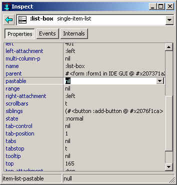 We want to change the name and the range of the single-item-list. Select the single-item-list by clicking on it. Sizing handles (the solid squares) appear around the selected component, as in the illustration. The Inspector window should now be inspecting the single-item-list component. Click in the name property, and type :list-box. Then click in the range field and type nil. Here is the Inspector after both changes have been made. Notice the single-item-list on the form is now blank (not illustrated). That is because we have set the range (the things displayed) to nil. In the application, when a user clicks the button, a dialog asking for a string will appear and whatever the user enters will become an item in the single-item-list.