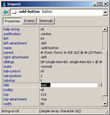 Now we want to change the name and the title of the button. Select the button, and go to the Inspector, change the name field to :add-button and the title field to Add…. Here is the Inspector when those changes are made. Also notice the title of the button on the form is changed to Add… .