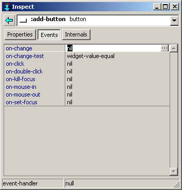 To modify the on-change event handler for the button, select the button and look at the Inspector. Click on the Events button and you will see the event handlers for the button. Actually, there aren't any – all the values are nil meaning all events are ignored (the on-change-test, the only item whose value is not nil, is an exception we do not discuss here).