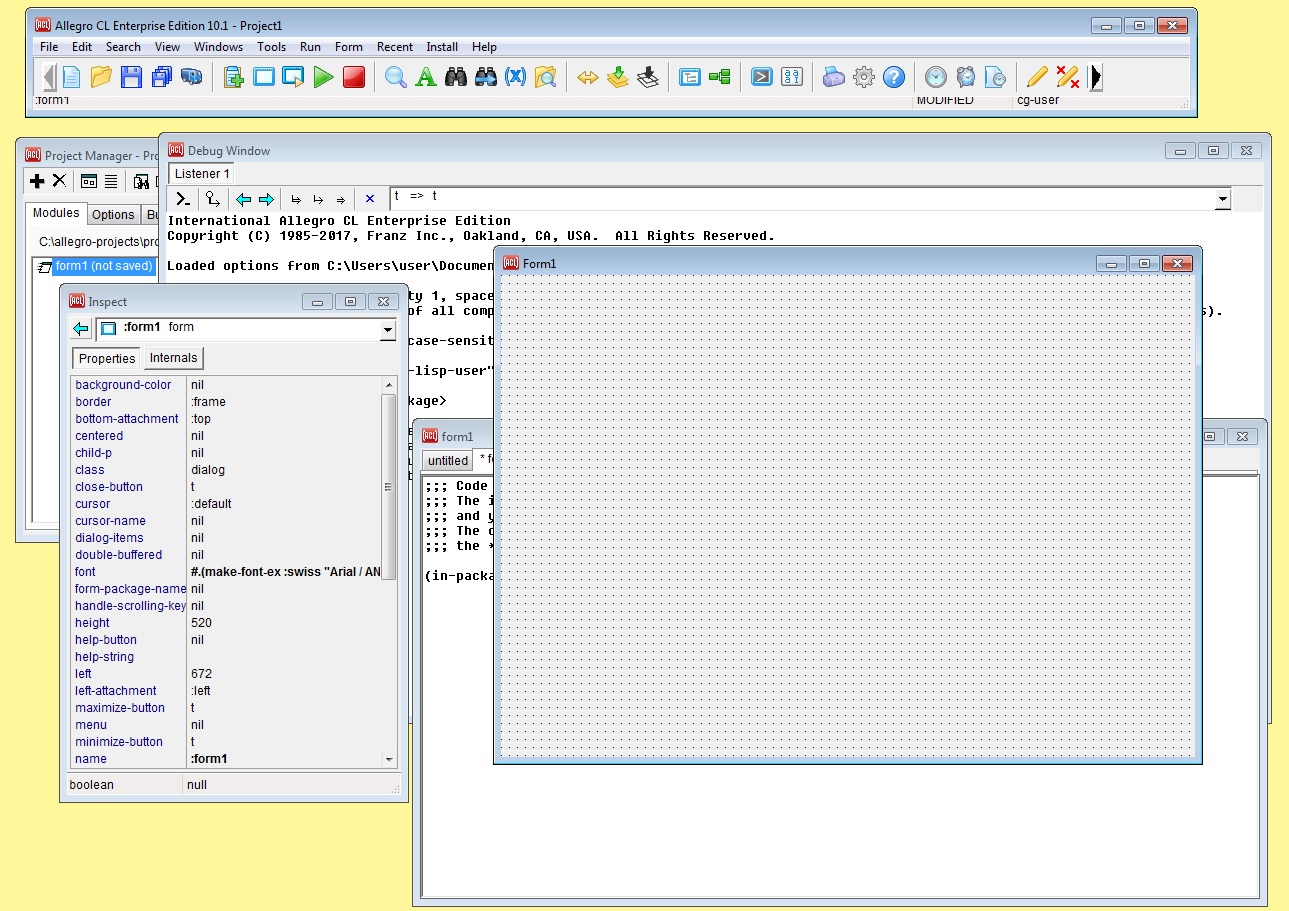 A project is a collection of modules associated with an application. With the modules and Allegro CL itself, you can build your application. Modules are parts of the application and have one or more associated files. Form1 is a module and has associated files form1.cl and form1.bil (we discuss these types of files in more detail in chapter 4).
