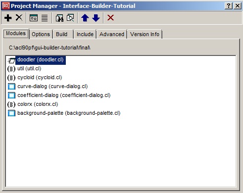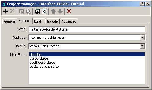The tutorial supplied with Allegro CL creates a project called :interface-builder-tutorial (producing the doodler application). It draws cycloidal curves in a window and allows you to set the background and line colors and to modify the curve being drawn. We will use this project as an example. You can bring up that project by clicking on Open Project in the File menu and then opening the file interface-builder-tutorial.lpr in <Allegro directory>\gui-builder-tutorial\final folder.
