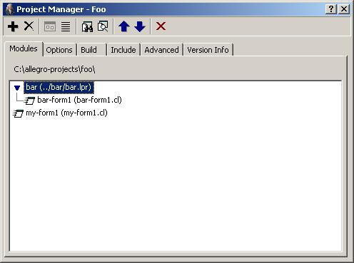 After selecting the subproject, it will appear near the top of the list of modules for the open project. (Subprojects are always loaded before the open project's own code so subprojects appear above any form or source code modules.) Here is the Modules tab for project foo after project bar has been added:
