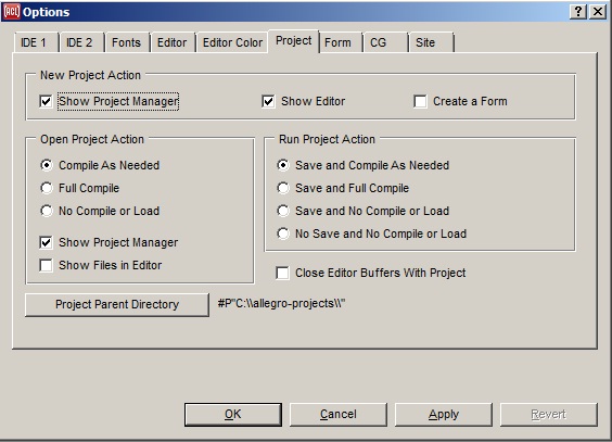 Run Project Action: just before running the current project, its files will be or will not be saved and/or compiled based on this option's setting. In the illustration, when a form is run, the files will be saved and incrementally compiled (Save and Compile as Needed is chosen).