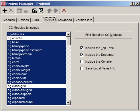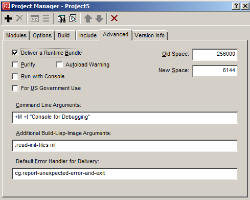 The include and advanced tabs allows further specification of options when building the application associated with the project. On the include tab, you can add and remove Allegro CL build modules. You can have these modules included or left out of the build by selecting or deselecting (so it is unhighlighted) modules. If a build module is not selected, its functionality will not be available in the application. If the functionality is truly unused, leaving it out is desirable since the resulting application will be smaller. But, if the module is in fact needed, the application may fail when the application executes and needs to use the needed but missing functionality (an error in the Console window may indicate this problem). There are various modules left out by default (none are illustrated). Simply click on a module to toggle its inclusion or exclusion. You are also asked whether you want to include the the top level (so there can be a Lisp listener -- some applications use that as the user interface). the debugger, or the compiler (you must be licensed to include the compiler). You can specify that local names in functions be saved. (Saving local names helps debugging, since debugger frames show actual local variable names rather than simple identifiers, but takes up space; it has no affect on the application absent a failure of some sort. See *load-local-names-info*.)
