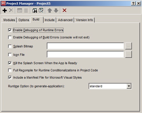 Additional choices allow displaying the icon in the system tray (when the application is running) allowing access to the Console and a way to interrupt the application; full recompilation when building the project distribution with the :runtime feature; and specification of the runtime type (standard – no compiler, dynamic – with compiler, partners – custom license). Note you may only choose the runtime options you are licensed to use (see runtime.html).