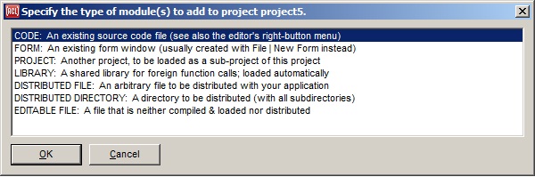 Files can be added to a project when a new form is created using New Form on the File menu or when a previously unsaved editror buffer is saved (you are asked if the file should be added to the current project). Files can also be added to a project by clicking the + button on the Project Manager toolbar. Clicking that button causes the following dialog to appear, which asks what sort of file you wish to add: