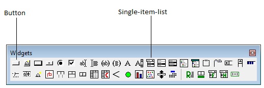 When viewing a form window that is selected, first click in the interior of the form to expose the Widget Palette. (Or use the Form | Show Widget Palette.) Then click on the button in the Widget Palette corresponding to the control of interest. In the illustration, we have identified the Button and Single-item-list controls: