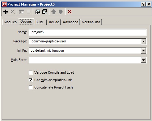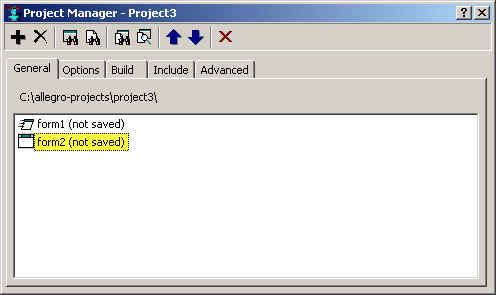Allegro CL starts with one blank form as part of a default project. The General tab of the project manager (displayed with View | Project Manager) shows all modules (a module may have one or more files associated with it) associated with a project. Form modules have two or three associated files: one .cl (source) file, one .bil file, and (if there are pixmaps associated with the form,) one .bml file. All have the same name but different extensions. The Project Manager shows the form name and the location of the form source (.cl) file if it is saved.