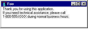 This window may be part of a standard project used as a subproject for various applications. The message may be the same for each application but the title (foo as displayed) should be the name of your application. If you are using this form for your Destructo application, your Gardening application, and your Thai Cooking application, Destructo, Gardening, and Thai Cooking should be the respective titles. Now, you can either have three different forms, one for each application, or you can have one form whose title property is set at runtime rather than design time. (And having one form means that only one form has to be changed if, for example, you get a new telephone number.)