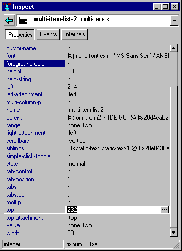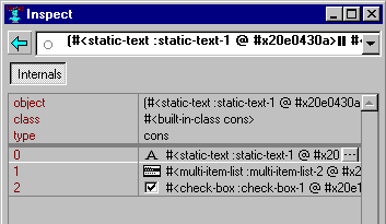The first lines describe the value (identifying it as a cons i.e. a list) whose elements are then listed the (still visible) static-text, the multi-item-list, and the check-box. Clicking on 1 (on the left) inspects the value of our invisible multi-item-list.