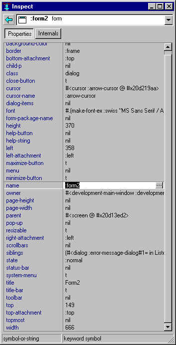 Note that this behavior is different from what happens when the window associated with the form is resized. The issue of what should happen to a component when the parent window is resized is complicated: should it be resized proportionally or remain the same size? If it remains the same size, should its location in the resized window be absolutely the same (still 100 pixels down from the top and 30 pixels right of the left border, say) or should they scale in proportion to the resizing (to 50 pixels down if the window height is halved). The behavior is controlled by the various attachment properties top-, bottom-, left-, and right-attachment. We will not discuss attachment in more detail here (see the online manual pages for attachment properties): we are emphasizing that this is a situation where the behavior of the form and the associated running window are different in that attachments are ignored on forms.