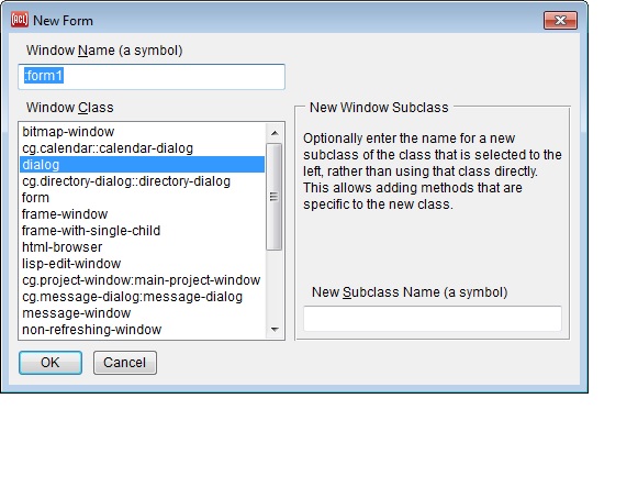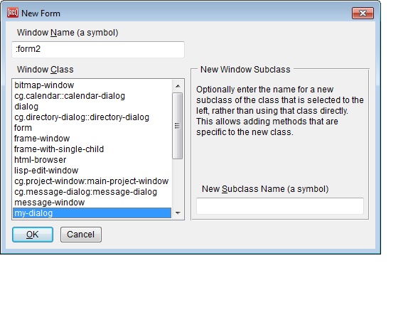 The choices shown identify the class property of the form (meaning the class of the application window created from the form). Note that the accessor of the class property is device (since class is a Common Lisp symbol and should not be overloaded with a function definition). If you define a new class (by subclassing the appropriate window class), it will be displayed in the dialog as well, as the following example shows. Define a subclass of dialog by entering my-dialog in the type-in widget on the New Form dialog, or by evaluating a form like the following in a listener: